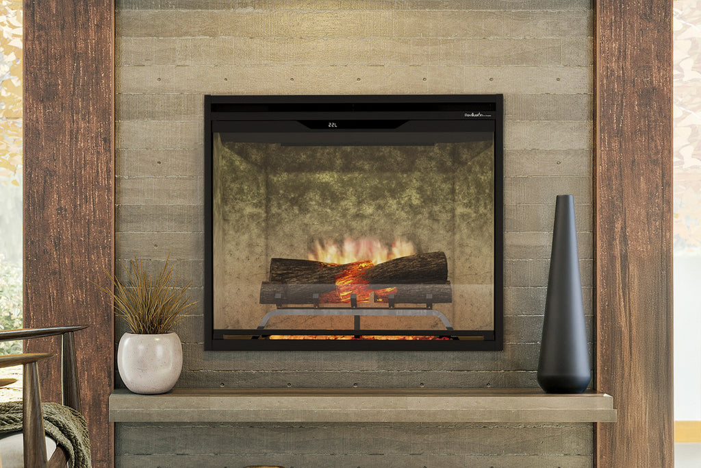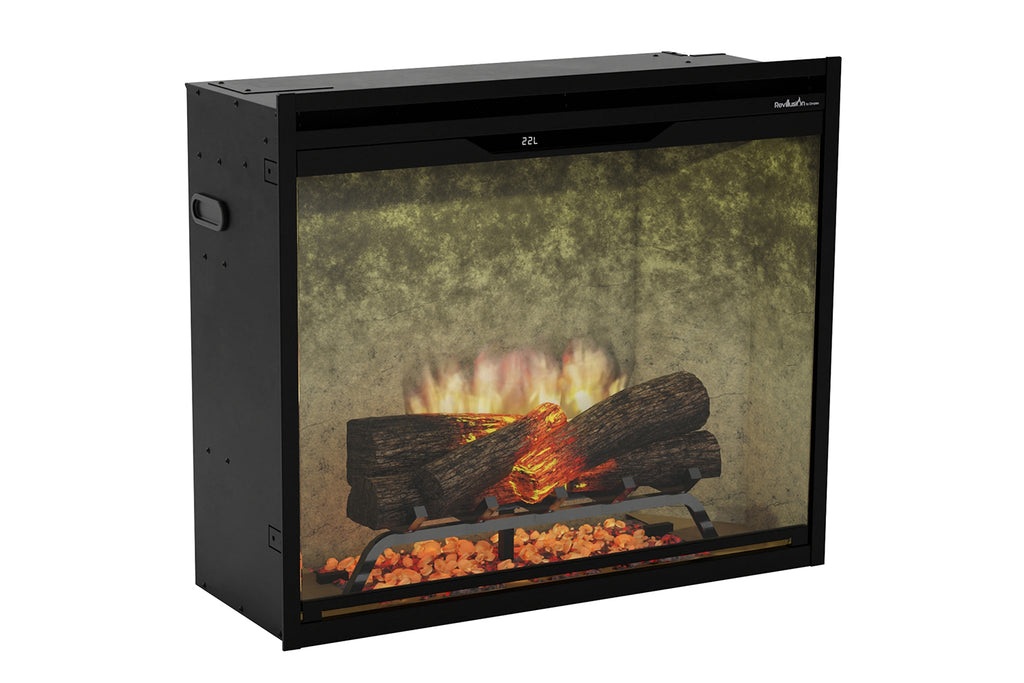 The Revillusion 30-inch Built-In Electric Firebox in Weathered Concrete offers a traditional fireplace ambiance with an industrial-chic aesthetic. Patented Revillusion technology creates bright random life-like flames that rise from the logs. The weathered concrete surround provides a gray textured look that complements both modern and rustic interior designs. Realistic LED flames rise from handcrafted glowing Realog. Partially frosted acrylic panel highlights flame without any reflections. Dynamic flame accents in yellow, red, and orange create a vivid, authentic traditional fireplace effect. Adjust brightness and flame speed to match your space and create your ideal atmosphere. The ember bed adds a layered glow with enhanced lighting, tumbled glass, and black gravel. Adjustable flicker settings deliver authentic firelight. Ambient Light Sensor automatically adjusts the firebox light to suit the room day to night. Ideal for any living room or bedroom, the Dimplex Revillusion Electric Firebox offers authentic fireplace ambiance without venting requirements or complicated installation.