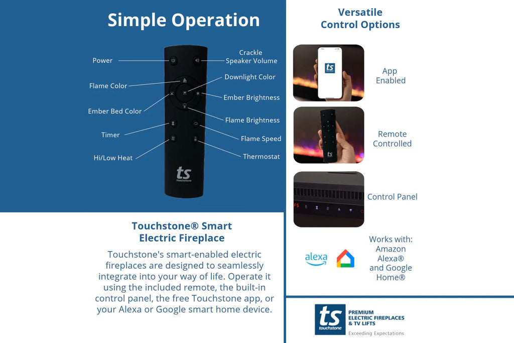 Smart-home ready with Alexa and Google certification, the Sideline Elite Pro Electric fireplace can be controlled via smartphone app, remote, or control panel. Easy recessed or wall mounted installation. Optional Spacer kit allows seamless installation for 2x4 walls. Two heat settings (750W/1500W) with thermostat control effectively warm rooms up to 400 sq. ft. Whether used for ambiance or with heat, the Touchstone Sideline Elite Pro Electric Fireplace creates a stunning focal point in any room.