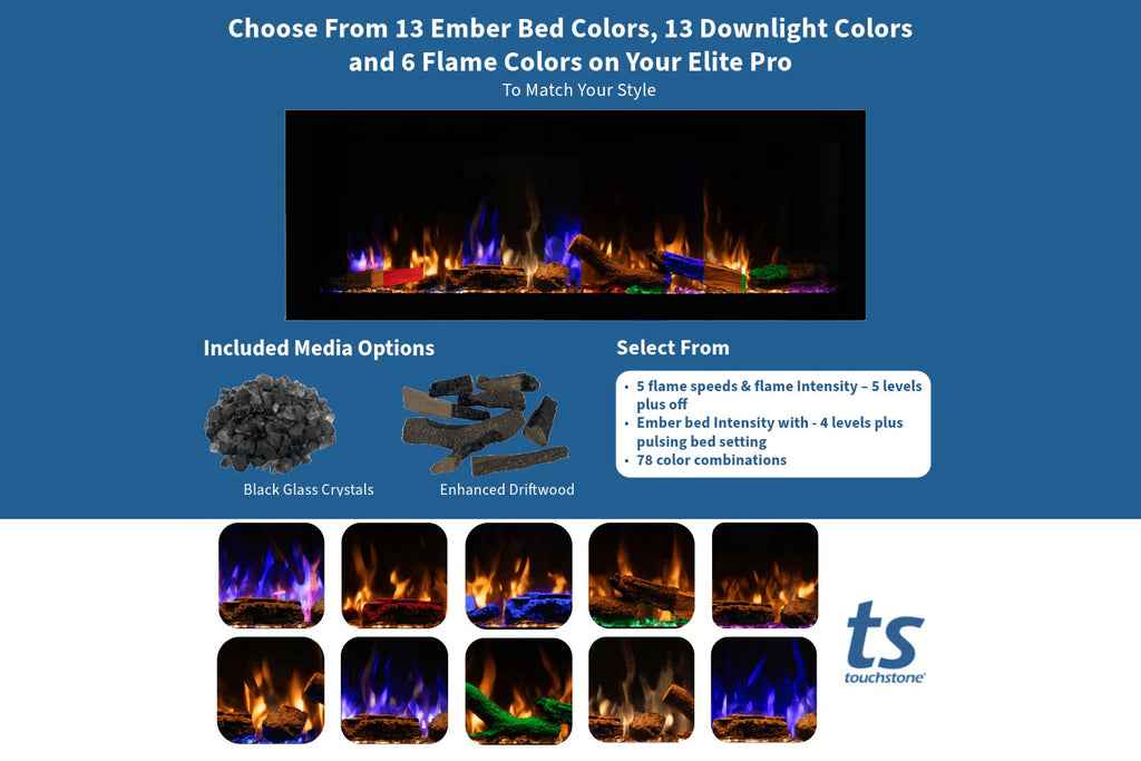 The Touchstone Sideline Elite Pro Smart Electric Fireplace combines professional-grade design with enhanced flame-depth technology. With its deep and high viewing area, the Sideline Elite Pro electric fireplace delivers an immersive display without the maintenance of a traditional fireplace. The new Touchstone Elite Pro offers exceptional customization with 6 vivid flame colors, 5 flame speeds, and 13 ember bed colors with multiple intensity levels, creating a range of unique combinations. The realistic log set and crushed glass crystals are accented by 13-color down-lighting. Built-in crackle speaker delivers authentic firewood sounds.