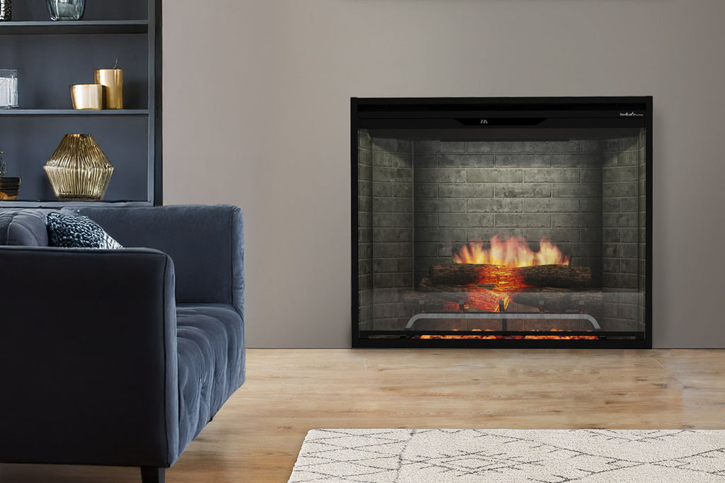 Dimplex Revillusion REV Series Available in 5 Sizes (24", 30", 36", 36" Portrait and 42") and 4 Interior Panel Options: Weathered Concrete Interior, Herringbone Brick Interior, Neutral Brick Interior and Black Interior.