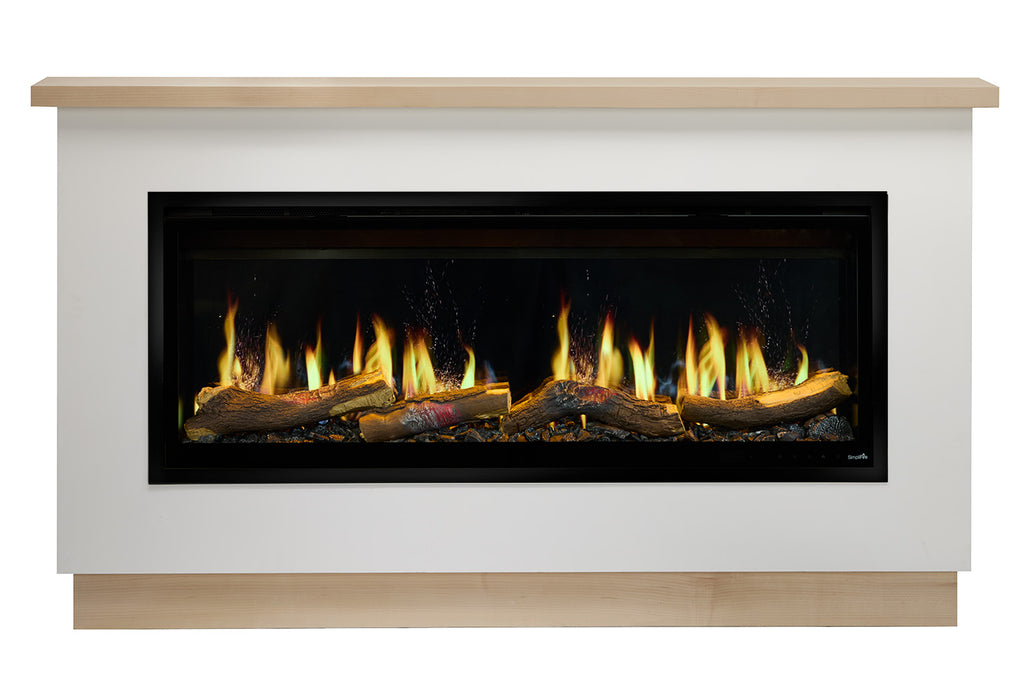 The SimpliFire Ready to Finish Mantel with Allusion Edge Virtual Electric Fireplace offers a sleek modern look with flexible customization. The ready-to-finish mantel can be easily colored with the desired paint or stain to match your decor. Includes 50" Allusion Edge virtual fireplace features four ultra-realistic digital flame effects. Choose from Tall Flame with sparks and smoke, Classic Flame with vibrant movement, Dancing Flame with contemporary motion, or Chromatic Flame in multiple colors. Select from 13 ember bed colors plus rotating mode. Premium glowing timber logs, black glass embers, and clear crystal stones accent the flame. Three adjustable, authentic fire sound effects enrich the ambiance.