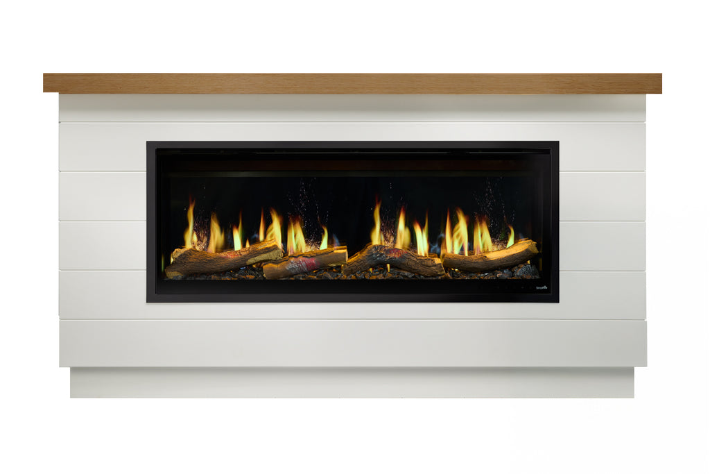 The SimpliFire Modern Farmhouse Mantel with Allusion Edge Virtual Electric Fireplace combines rustic charm with traditional elegance. The sleek white painted shiplap mantel creates an instant focal point. Includes 50" Allusion Edge virtual fireplace features four ultra-realistic digital flame effects. Choose from Tall Flame with sparks and smoke, Classic Flame with vibrant movement, Dancing Flame with contemporary motion, or Chromatic Flame in multiple colors. Select from 13 ember bed colors plus rotating mode. Premium glowing timber logs, black glass embers, and clear crystal stones accent the flame. Three adjustable, authentic fire sound effects enrich the ambiance.